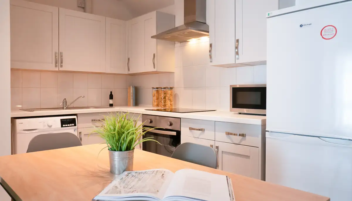 The bright communal lounge includes large sofas, a flat-screen TV and a roomy dining area – ideal for movie nights, group dinners or relaxing with housemates. The kitchen is fitted with contemporary appliances, multiple fridges and a washing machine, making everyday life simple and convenient.
