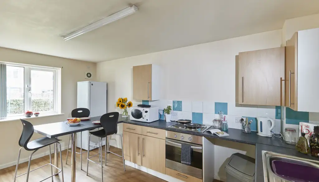 The kitchen comes ready with modern appliances, multiple fridges and you’ll have access to a shared washer and dryer, with washes at £3.80 and drying at £2.70.