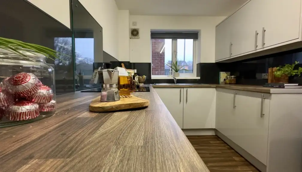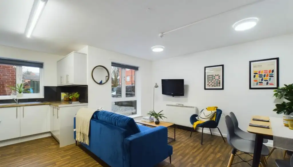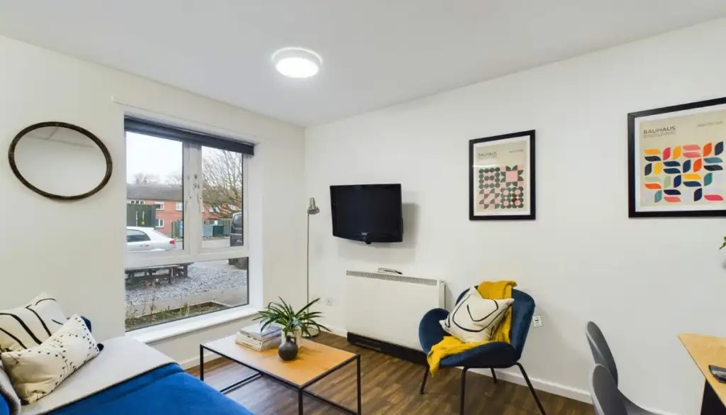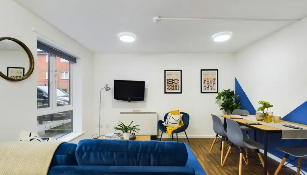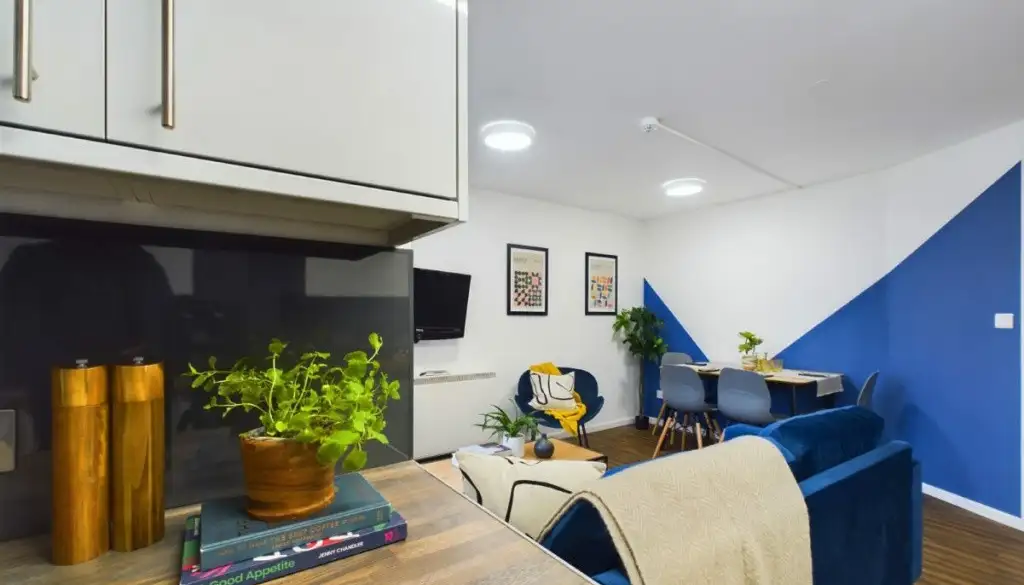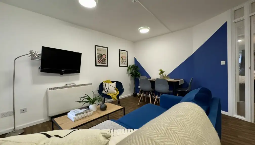 The open-plan living area features large sofas, a flat-screen TV and a dining table, ideal for shared meals or relaxed evenings with housemates. The fully equipped kitchen includes modern appliances and multiple fridges, and you’ll have access to a shared washer and dryer, with washes at £3.80 and drying at £2.70 making day-to-day life simple and practical.