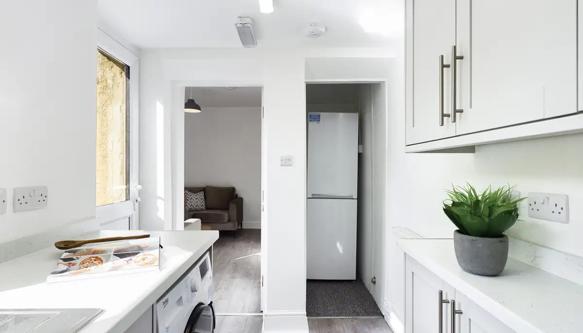 The bright, open living room features plush sofas and a large flat-screen TV - perfect for relaxing or catching up with housemates. The modern kitchen comes fully equipped with contemporary appliances, multiple fridges, and a washing machine, providing everything you need for effortless everyday living.