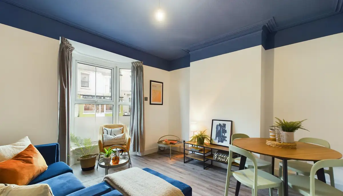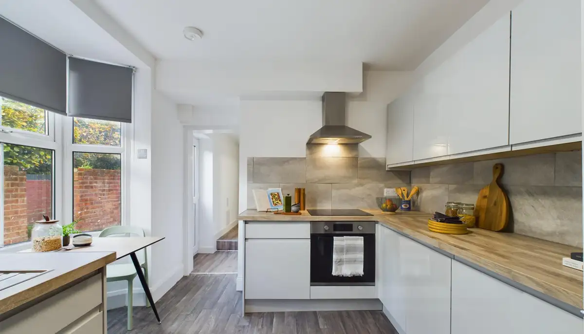 Situated on Monks Road, this stylishly refurbished property boasts six double bedrooms, each furnished with desks, comfortable chairs, and ample storage. The inviting living room features spacious sofas and a large flat-screen TV, perfect for social gatherings or relaxation, complemented by a generously sized dining table. The kitchen is equipped with modern appliances, multiple fridges, and a washing machine, ensuring convenience for residents.