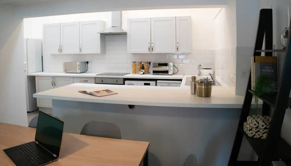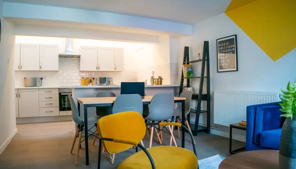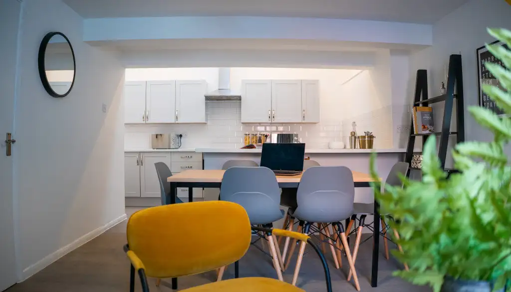 This property offers seven bedrooms, each furnished with desks, comfortable chairs, and ample storage, along with two contemporary bathrooms for added convenience. The inviting living room boasts large, plush sofas and a generous flat-screen TV, perfect for relaxed socialising, complemented by a breakfast bar and a dining table for communal meals. The kitchen is equipped with modern appliances, multiple refrigerators, and a washing machine.