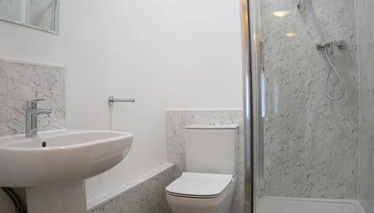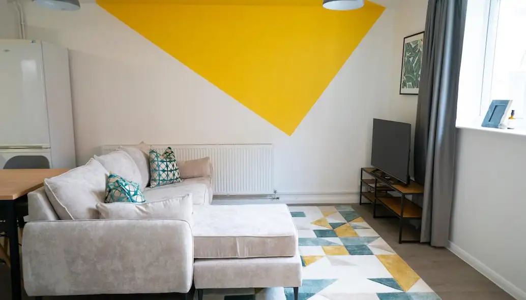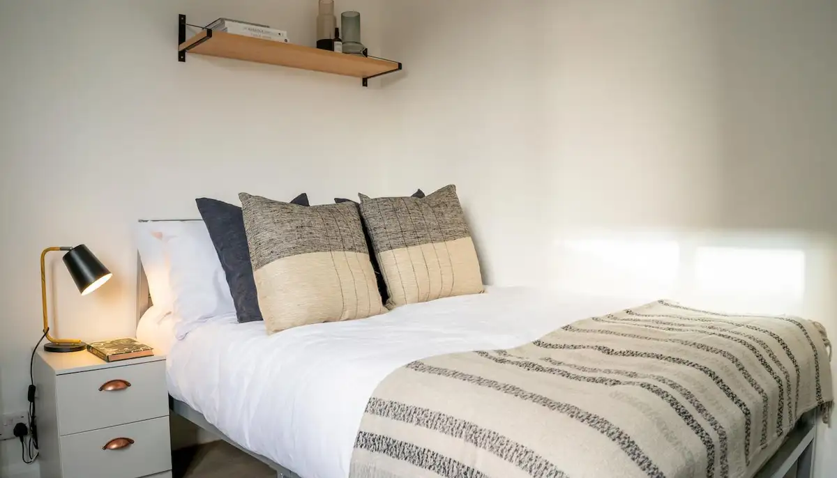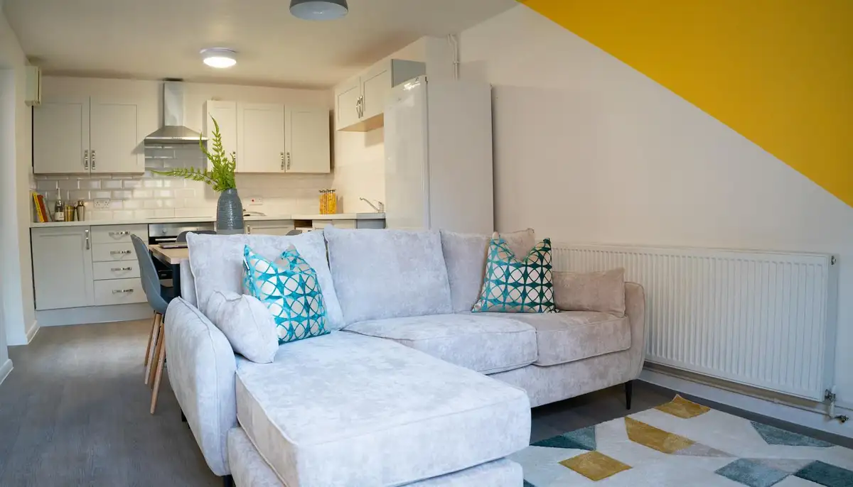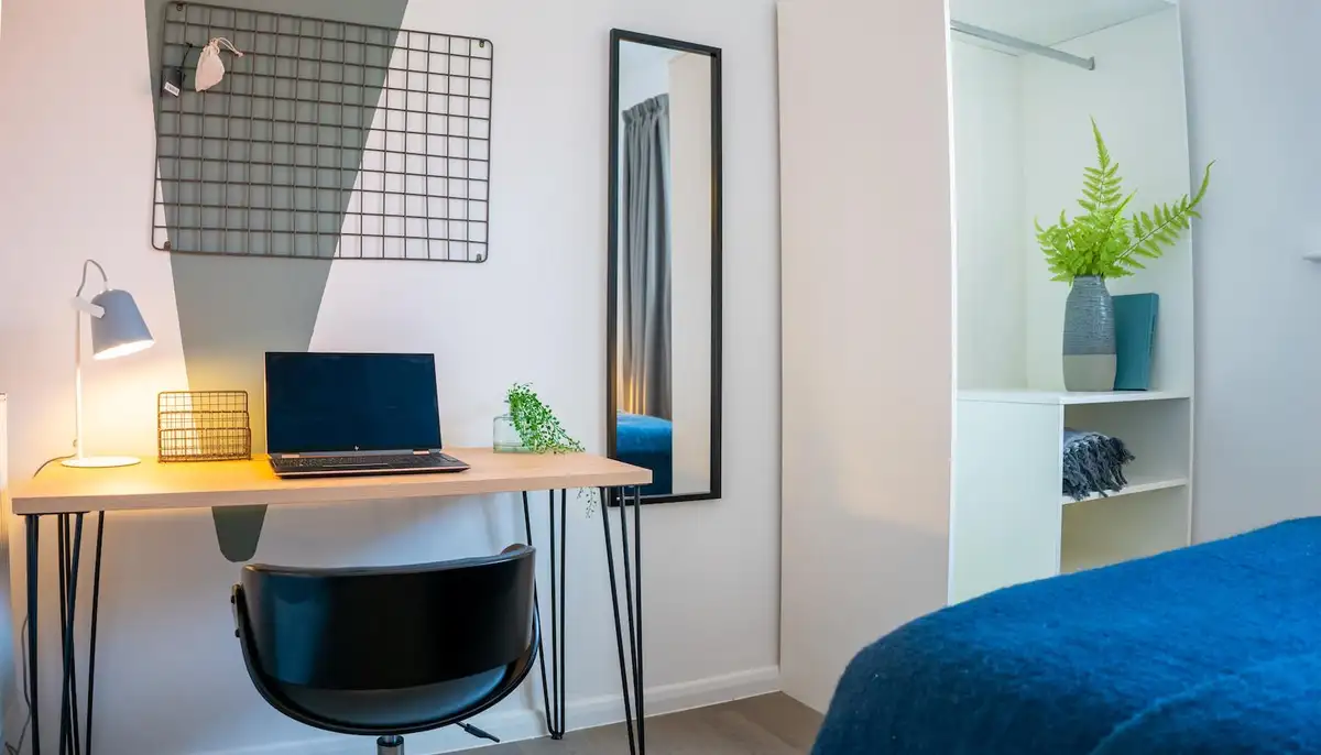 This property offers five double bedrooms furnished with desks, comfortable chairs, and ample storage. Two contemporary bathrooms add to the convenience. The chic living room features large sofas and a flat-screen TV, ideal for relaxed gatherings, while a spacious dining table encourages communal dining. The kitchen is equipped with modern appliances, multiple fridges, and a washing machine.