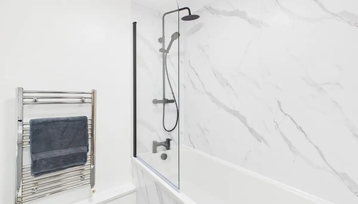 The spacious living room features a plush sofa and large flat-screen TV, ideal for relaxing or socialising, along with a dedicated dining area for shared meals. The kitchen is fully equipped with modern appliances and a fridge freezer, and communal washing and drying facilities are available on site (approx. £4.60 per cycle).
