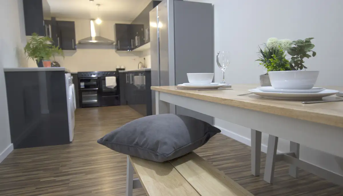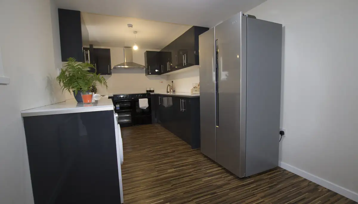 Inside, the property offers six generously sized double bedrooms, two modern bathrooms, and a communal living space designed for relaxation and socialising – complete with comfy sofas and a large flat-screen TV. The kitchen is fully equipped with contemporary appliances, multiple fridges and a washing machine, making shared living easy.