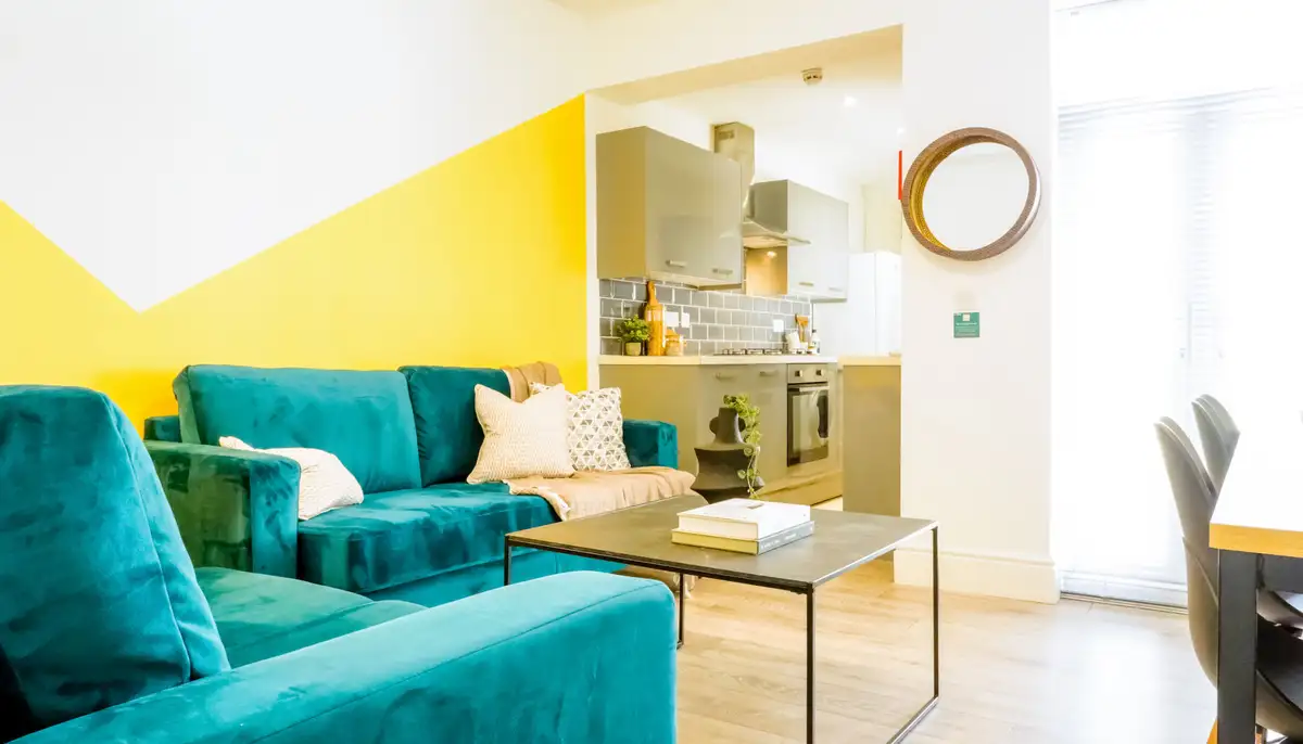 The bright living area features comfortable sofas and a large flat-screen TV, ideal for relaxing or socialising with housemates, while the well-equipped kitchen includes modern appliances and multiple fridges for easy day-to-day living.