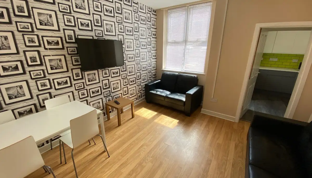 The spacious living room features comfortable sofas and a large flat-screen TV, making it the perfect spot to unwind or catch up with housemates after lectures.